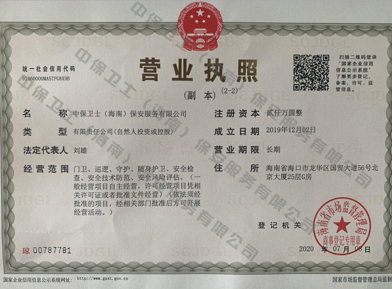 沈阳俊伟航空运输有限公司是经海南省公安厅批准,依法持有《保安服务许可证》,提供保安服务、门卫、巡逻、守护、区域秩序维护、随身护卫、安全检查的专业化保安服务公司。